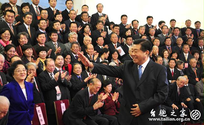 中共中央政治局常委、全國(guó)政協(xié)主席賈慶林在北京人民大會(huì)堂會(huì)見(jiàn)出席全國(guó)臺(tái)聯(lián)成立30周年紀(jì)念大會(huì)的海內(nèi)外臺(tái)胞。徐波/攝影