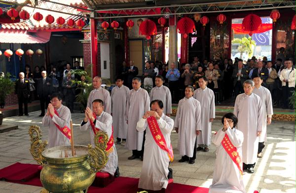 2月7日,我們一行有幸參與了南投縣竹山鎮(zhèn)沙東宮一年一度的春祭大典。與其它廟宇不同,沙東宮的春祭以“官祭”為特色,即主祭官、陪祭官、執(zhí)事等多由縣政府官員或縣議員擔(dān)任,以表尊崇。大家均身著古裝長(zhǎng)袍馬褂,遵循古制行三獻(xiàn)禮,儀式莊嚴(yán)隆重。