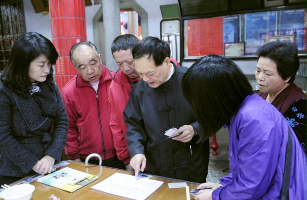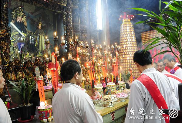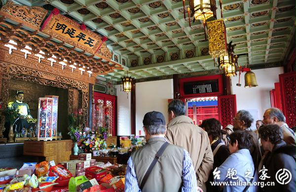 祖籍臺(tái)灣彰化和美的鄭大團(tuán)長(zhǎng)(前排左一)在彰化老家的鄭成功廟祭拜國(guó)姓爺。徐波/攝影
