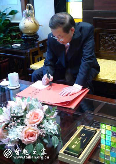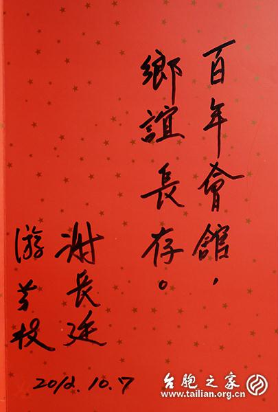 參觀結(jié)束后,謝長(zhǎng)廷先生為北京臺(tái)灣會(huì)館題字:“百年會(huì)館 鄉(xiāng)誼長(zhǎng)存”。(北京臺(tái)灣會(huì)館 臺(tái)胞之家網(wǎng))