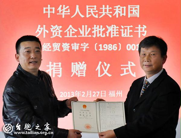 經(jīng)國(guó)家博物館提議,福建省臺(tái)聯(lián)積極牽線搭橋,今天,黃益建先生無(wú)償?shù)鼐栀?zèng)保存了近30年之久的“投資企業(yè)批準(zhǔn)證書”,為兩岸關(guān)系和平發(fā)展進(jìn)程留下珍貴的見證物,黃先生的捐贈(zèng)心愿也是兩岸同胞期盼兩岸關(guān)系和平發(fā)展的最好證明。(鄭嵐)