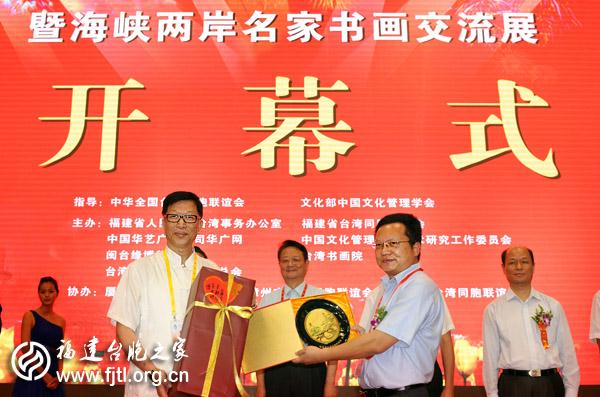 福建省臺(tái)聯(lián)副會(huì)長(zhǎng)梁志強(qiáng)(右)與臺(tái)灣嘉賓臥龍先生交換紀(jì)念品 鄭嵐/攝影