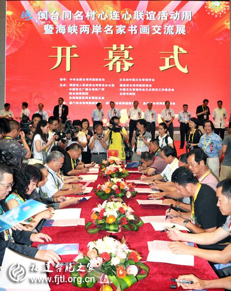 參加今天開幕式的有全國人大常委、全國臺(tái)聯(lián)會(huì)長(zhǎng)汪毅夫、省人大常委會(huì)副主任張建。省臺(tái)聯(lián)黨組書記、省臺(tái)辦副主任蔡爾申主持開幕式。全國臺(tái)聯(lián)會(huì)長(zhǎng)汪毅夫宣布同名村·心連心聯(lián)誼活動(dòng)暨海峽兩岸名家書畫交流展開幕。臺(tái)灣南投草屯鎮(zhèn)前鎮(zhèn)長(zhǎng)賴忠政主持同名村對(duì)接簽約儀式。(鄭嵐)