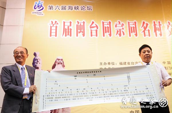 臺(tái)灣族譜專(zhuān)家陸炳文、福建省姓氏源流研究會(huì)副會(huì)長(zhǎng)蔡干豪、兩岸同宗同名村臺(tái)灣宗親代表張昭五先后在大會(huì)上發(fā)言。期間,兩岸同宗同名村代表向閩臺(tái)緣博物館捐贈(zèng)了族譜文獻(xiàn)資料,38套臺(tái)灣宗親譜牒落戶泉州。臺(tái)灣譜牒專(zhuān)家、海峽兩岸和諧文化交流協(xié)進(jìn)會(huì)會(huì)長(zhǎng)陸炳文先生向閩臺(tái)緣博物館轉(zhuǎn)交了中國(guó)國(guó)民黨副主席、嘉義市市長(zhǎng)黃敏惠的題詞“源遠(yuǎn)流長(zhǎng)”和臺(tái)灣著名學(xué)者余光中的題詞“根索水而入土 葉追日而上天”。