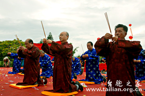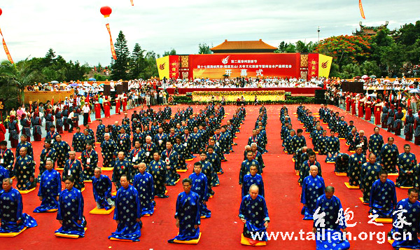開幕式上,海內(nèi)外信眾舉行了祭祀關帝大典。當震天的禮炮響過之后,在“和平曲”的輕歌曼舞之中,三百多名身著藍色謁祖禮服、肩披紅色彩帶的各宮廟董事會成員,在關帝廟門口廣場排成方陣,在祖廟理事長和臺灣關帝廟代表的帶領下,面向祖廟行三跪九叩大禮。坐在廣場周圍的其他臺灣各宮廟信眾也靜靜祈禱,祭祀慶典還舉行了樂舞表演、祈福誦經(jīng)活動,體現(xiàn)了“人同根”、“神同源”的思想理念。