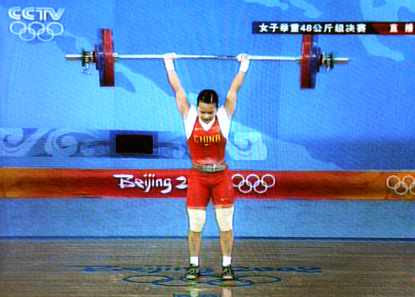 中國隊的陳燮霞以總成績212公斤為中國代表團奪得本屆奧運會的首枚金牌