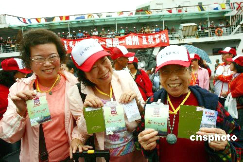 2008年11月8日上午11:30,由馬祖經(jīng)貿(mào)文化交流聯(lián)誼會理事長陳雪生先生帶隊,馬祖、金門及臺灣本島福州鄉(xiāng)親約500人搭乘“臺馬輪”從臺灣基隆經(jīng)彎靠馬祖福澳港后抵達福州港客運碼頭。臺胞王秀亮(左一)、王秀明(中)兩姐妹帶著母親(右一)來到福州。中新社發(fā) 祝敏松 攝