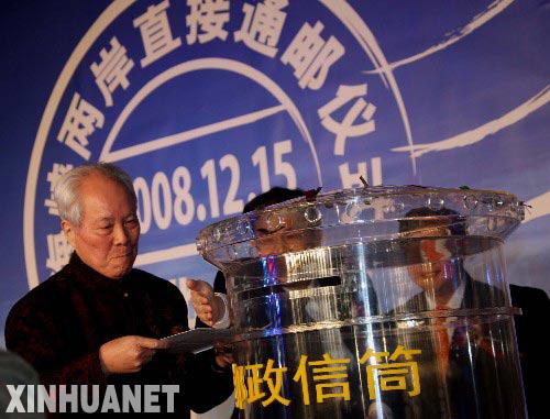 新華網(wǎng)北京12月15日電(記者 劉暢)海峽兩岸直接通郵儀式15日9時(shí)許在北京航空郵件交換站舉行,兩岸全面、直接、雙向通郵正式啟動(dòng)。投下第一封直郵家書(shū)的是出生在臺(tái)灣、現(xiàn)居北京的一位81歲老人。中國(guó)國(guó)民黨副主席林豐正,和大陸交通運(yùn)輸部副部長(zhǎng)馮正霖、國(guó)家郵政局局長(zhǎng)馬軍勝、國(guó)臺(tái)辦副主任孫亞夫、北京市副市長(zhǎng)茍仲文、海協(xié)會(huì)副會(huì)長(zhǎng)張銘清等大陸有關(guān)方面負(fù)責(zé)人等約150人出席了直接通郵儀式。