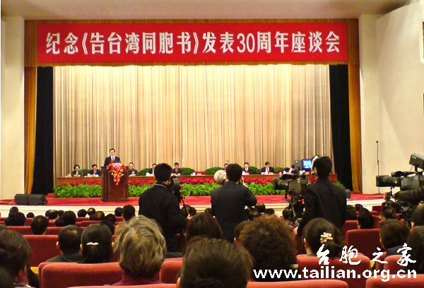 臺胞之家網(wǎng)12月31日訊: 紀(jì)念《告臺灣同胞書》發(fā)表30周年座談會今天上午在北京人民大會堂隆重舉行。中共中央總書記、國家主席、中央軍委主席胡錦濤出席座談會并發(fā)表重要講話。