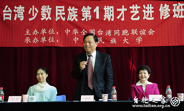 全國(guó)臺(tái)聯(lián)會(huì)長(zhǎng)梁國(guó)揚(yáng)(中)在結(jié)業(yè)儀式上致辭。左為全國(guó)臺(tái)聯(lián)副會(huì)長(zhǎng)陳杰(阿美族)。 徐波 攝