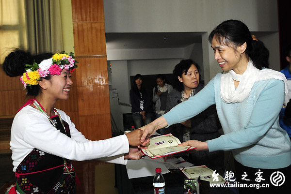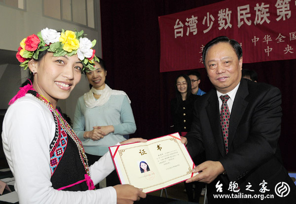 全國(guó)臺(tái)聯(lián)副會(huì)長(zhǎng)陳杰(阿美族)在結(jié)業(yè)儀式上為學(xué)員們頒發(fā)結(jié)業(yè)證書(shū)。 徐波 攝