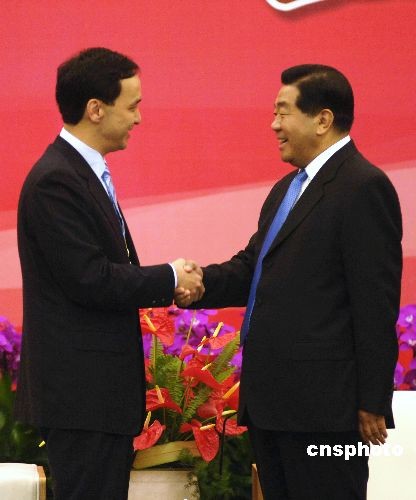 5月16日下午,中共中央政治局常委、全國政協(xié)主席賈慶林在廈門會見前來參加首屆海峽論壇的臺灣嘉賓代表,并與中國國民黨副主席朱立倫親切交談。 中新社發(fā) 王東明 攝