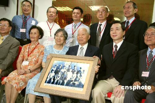 5月29日,前全國政協(xié)副主席張克輝來到位于臺北市西寧北路的“彰商校友會館”與昔日同窗聚會。圖為張克輝(右三)抱著校友會贈送給他的一幅1944年的師生合影照片與大家合影。 中新社發(fā) 耿軍 攝