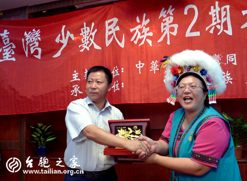 全國臺聯(lián)會長梁國揚(左)與原住民族學(xué)員領(lǐng)隊高淑娟(右)互贈紀(jì)念品。 徐波 攝影