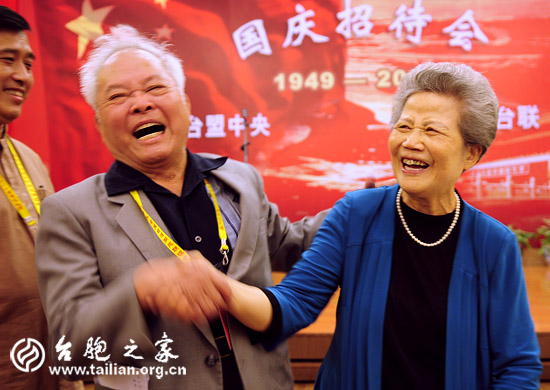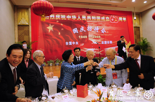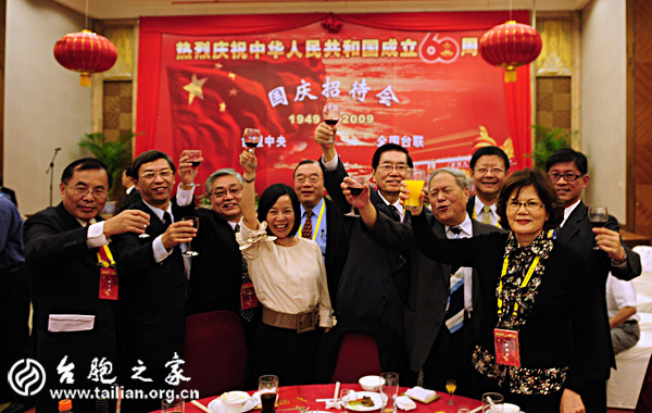 全國政協(xié)副主席、臺盟中央主席林文漪,全國政協(xié)原副主席、全國臺聯(lián)名譽(yù)會長張克輝,全國政協(xié)港澳臺僑委員會主任、海峽兩岸關(guān)系協(xié)會會長陳云林,全國人大常委、全國臺聯(lián)會長梁國揚(yáng)等領(lǐng)導(dǎo)出席了招待會。出席招待會還有中央統(tǒng)戰(zhàn)部、國臺辦、臺盟中央、全國臺聯(lián)相關(guān)部門的領(lǐng)導(dǎo)。 臺盟中央、全國臺聯(lián)組織的國慶觀禮團(tuán)全體嘉賓與部分在京臺胞約600人歡聚一堂,同慶祖國60華誕、共敘鄉(xiāng)親情誼。