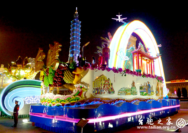 “寶島臺(tái)灣”彩車也是廣場(chǎng)上最受青睞的彩車之一,其中寓意豐富,有蝴蝶蘭、釋伽、鳳梨等特色花卉和水果,有101大廈、寓意兩岸“三通”的飛機(jī)與七色彩虹,車身兩側(cè)還繪有自從先民開拓寶島至臺(tái)灣光復(fù)這段歷史的彩畫。徐波 攝影