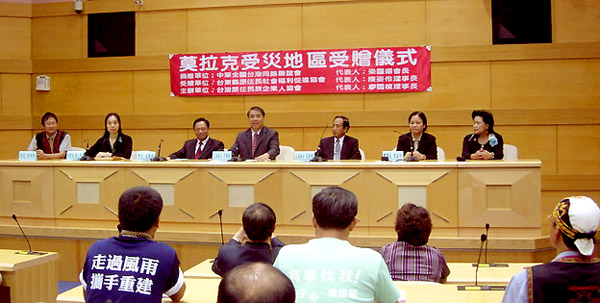 全國臺聯(lián)向莫拉克受災地區(qū)受災捐贈儀式。左起:臺東大學理工學院劉炯錫院長、全國臺聯(lián)副會長陳杰、全國臺聯(lián)會長梁國揚、廖國棟“立委”、簡東明“立委”、陳姿伶理事長、瑪家鄉(xiāng)北葉國小戴校長