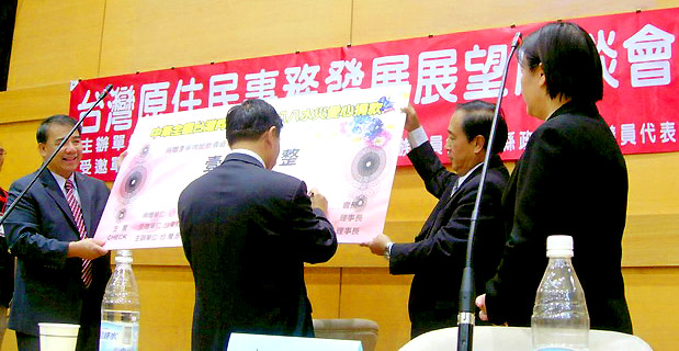 全國臺聯(lián)會長梁國揚參加臺灣原住民事務發(fā)展座談會八八水災捐贈簽名儀式。