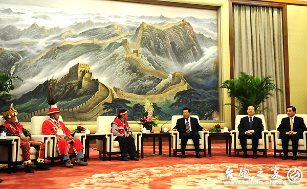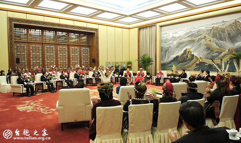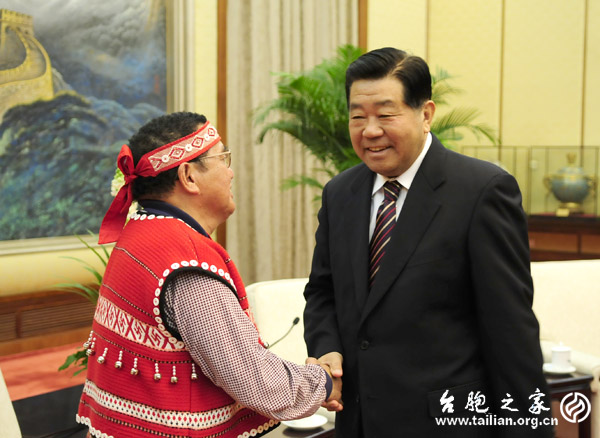 中共中央政治局常委、全國政協(xié)主席賈慶林在北京人民大會堂會見臺灣少數(shù)民族代表人士訪問團一行并與代表們座談。臺胞之家網(wǎng) 徐波/攝影