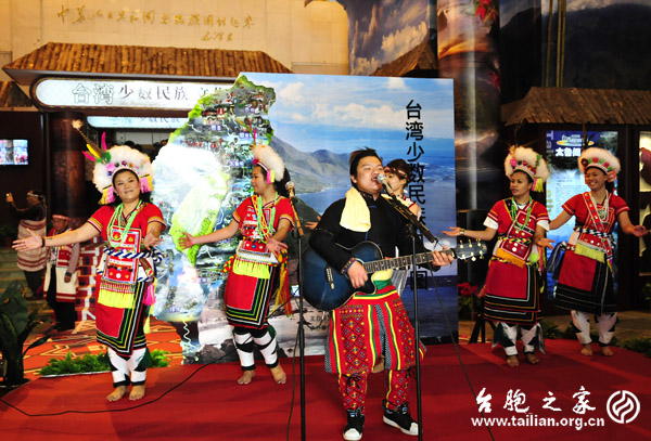 來自島內(nèi)部落的臺灣少數(shù)民族藝術(shù)家在序廳為觀眾表演原生態(tài)的民族歌舞。 徐波/攝影