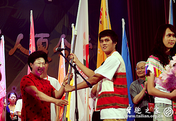 中央統(tǒng)戰(zhàn)部副部長尤蘭田(左)授夏令營總營營旗。 徐波/攝影