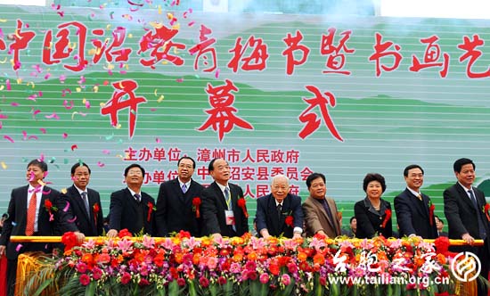 臺胞之家網(wǎng)訊:以“打響品牌、展現(xiàn)魅力、拓展平臺、跨越發(fā)展”為主題的第四屆中國(詔安)青梅節(jié)暨書畫藝術(shù)節(jié),今天上午在福建漳州詔安縣舉行隆重開幕儀式。九、十屆全國政協(xié)副主席張克輝出席開幕式。國家、省、市及有關(guān)部門領(lǐng)導(dǎo)、閩粵周邊縣市(區(qū))有關(guān)領(lǐng)導(dǎo)、社會各界人士共計(jì)1000多人參加了青梅節(jié)的開幕式。省臺盟副主委江爾雄、省臺聯(lián)副會長柯連妹以及臺灣工黨主席鄭昭明應(yīng)邀出席開幕式。