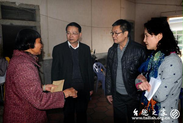 省臺聯(lián)領導走訪慰問深受基層臺胞的歡迎,他(她)們拉著省臺聯(lián)干部的手,有時雖說語言不通(莆仙話),但一個眼神和緊握有力的雙手,都能感受到基層困難臺胞對黨和政府的關心和來自“臺胞之家”的溫暖的感激之情;也體現(xiàn)出省臺聯(lián)一如既往地關心廣大臺胞,為困難臺胞排憂解難,受到廣大臺胞的肯定和擁護。(鄭嵐)