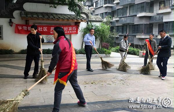 省臺(tái)聯(lián)機(jī)關(guān)志愿者與共建社區(qū)干部一起清掃垃圾 沈秀琴/攝影
