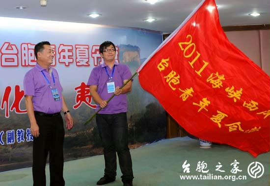 福建省臺(tái)聯(lián)秘書長(zhǎng)張巖代表主辦單位向臺(tái)灣營(yíng)員授旗 攝影/鄭嵐
