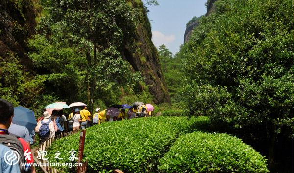 當(dāng)日,北下、南上的兩隊(duì)營(yíng)員匯聚武夷山,展開福建茶鄉(xiāng)尋祖的旅程。營(yíng)員們首先參觀了著名的大紅袍景區(qū),親眼目睹至今已有350多年歷史、在清代即已名揚(yáng)天下,如今作為古樹名木列入世界自然與文化遺產(chǎn)的6株大紅袍母樹,它是武夷巖茶高貴品質(zhì)的象征,具有豐厚的茶文化內(nèi)涵。