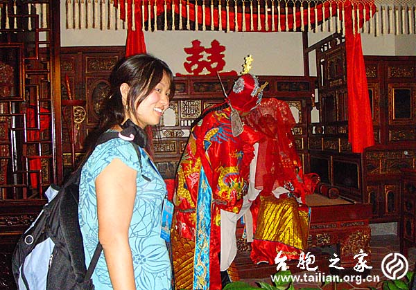 在講解員的帶領(lǐng)下,青年臺胞們沿著大廳兩旁回廊式的展廳移步觀賞。從“遠(yuǎn)古家園”、“血脈相親”到“隸屬與共”、“開發(fā)同功”,從“文脈相承”、“諸神同祀”到“風(fēng)俗相通”,營員們從實(shí)物、圖片、蠟像、雕塑、聲電光展示中感受歷史、感受海峽兩岸同根同源、密不可分。熟悉、濃郁的閩南文化氣息和鄉(xiāng)音鄉(xiāng)俗讓臺胞青年們倍感親切,帶隊(duì)的老師饒有興趣地說:“閩南地區(qū)女孩子出嫁絞面的習(xí)俗臺灣也有,只是現(xiàn)在不多了,這可是美容的一種方法呀!”旁邊的臺灣逢甲大學(xué)的李永源同學(xué)說:“感覺好奇特哦!我祖籍是福建,來到這里,就好像回到了老家的大厝,一樣的建筑風(fēng)格,一樣的閩南語調(diào),一樣的生活場景,我有了一種回家的感覺耶!”。
