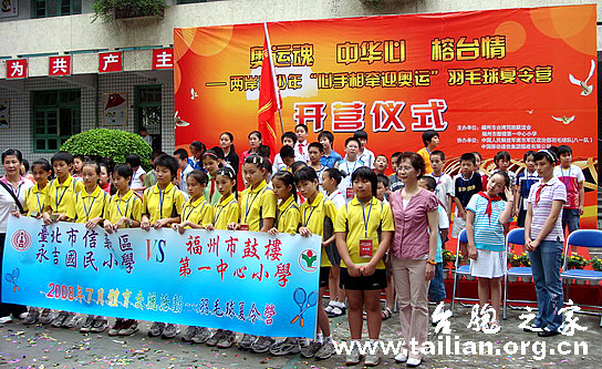 7月8日上午,在距北京奧運(yùn)會(huì)開(kāi)幕還剩整整一個(gè)月之際,由福州市臺(tái)聯(lián)主辦、以“心手相牽迎奧運(yùn)”為主題的海峽兩岸青少年羽毛球夏令營(yíng)在福州正式拉開(kāi)序幕。來(lái)自臺(tái)北市永吉國(guó)小的18名愛(ài)好羽毛球的師生和福州市鼓一小的師生一起參加了此次羽毛球夏令營(yíng)活動(dòng)。
