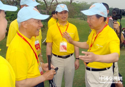 第一屆海峽兩岸退役將軍高爾夫球邀請賽在廈門舉行,圖為參賽者在交談。