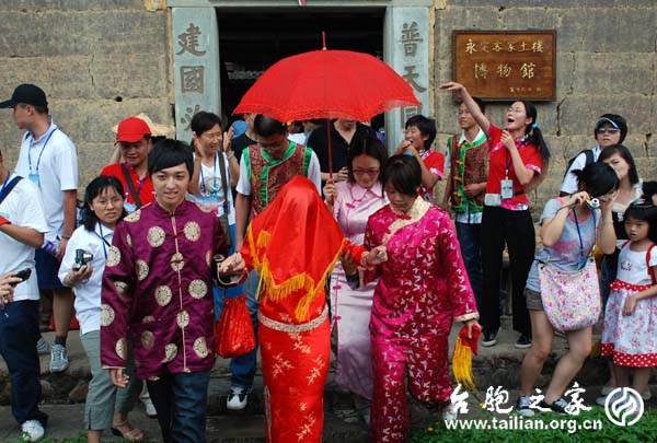海峽西岸2008年臺胞青年夏令營的臺灣營員體驗客家傳統(tǒng)婚俗(攝影:鄭嵐)