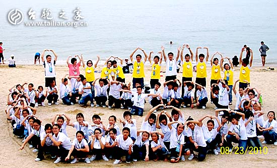 看!大海的對岸就是臺灣。隨團鄧導游一聲喊,讓游覽車內(nèi)一片歡騰,原來大陸離臺灣這么近,在廈門環(huán)島路眺望對岸寶島臺灣近在咫尺。小天使都迫不及待地想下車,善解人意的鄧導游就讓司機把車停在路邊,小天使抓起照相機瘋狂般地跳下車,脫掉鞋子、扔掉襪子沖向沙灘,奔向大海喊道:“我來啦”!陽光、沙灘、白浪……,如此熟悉的詩情畫意在美麗的鷺島讓臺灣小天使如癡如醉,隨團的臺灣隊輔大哥帶領小天使在沙灘上寫下“臺灣和平小天使”七個大字,并在七個大字的外圍畫下一個大大的“心”字圖案,然后大家圍在“心”字中央歡呼跳躍。此時此刻身在海峽西岸的海峽東岸小天使看看大陸,想想臺灣,內(nèi)心想必是百感交集,感慨萬千。