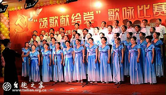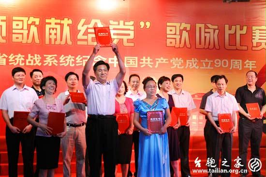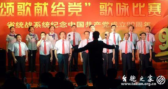 臺(tái)胞之家網(wǎng)訊:為隆重紀(jì)念中國(guó)共產(chǎn)黨成立90周年,6月24日下午,福建省統(tǒng)戰(zhàn)系統(tǒng)“頌歌獻(xiàn)給黨”歌詠比賽在“同心樓”舉辦。省政協(xié)副主席、省委統(tǒng)戰(zhàn)部長(zhǎng)張燮飛、副部長(zhǎng)翁卡,省社會(huì)主義學(xué)院、各民主黨派、有關(guān)人民團(tuán)體機(jī)關(guān)負(fù)責(zé)人與上述單位組成的14支代表隊(duì)齊集一堂,用心聲唱出對(duì)黨的一片深情和對(duì)祖國(guó)母親的熱愛。