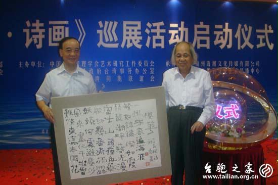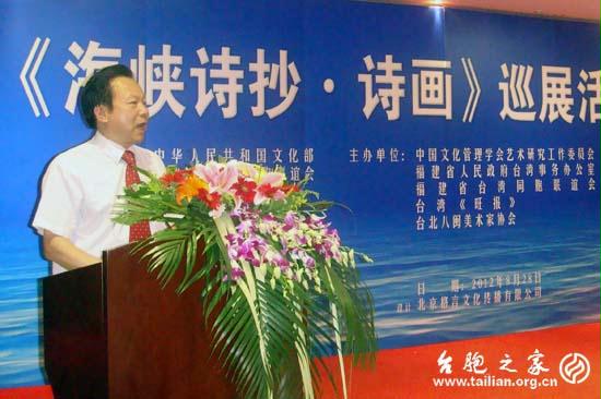 啟動(dòng)儀式上,福建省臺(tái)辦副主任、福建省臺(tái)聯(lián)黨組書記蔡爾申代表主辦單位致辭。他首先向關(guān)心支持巡展活動(dòng)的國家文化部、全國臺(tái)聯(lián)等有關(guān)部門和領(lǐng)導(dǎo)以及社會(huì)各界人士表示衷心的感謝,對(duì)前來出席啟動(dòng)儀式的領(lǐng)導(dǎo)和嘉賓表示熱烈的歡迎。他指出,中國是詩歌大國、書畫大國,詩歌與書畫是中華民族悠久文化的精華和瑰寶。自古以來,海峽兩岸涌現(xiàn)出許多愛國愛鄉(xiāng)的詩人、書法家及美術(shù)家。他們膾炙人口、美輪美奐的詩歌、書畫作品,融思想性于藝術(shù)性之中,是兩岸民族文化向心力及凝聚力的精髓所在。這些作品,不但能體現(xiàn)海峽兩岸同胞愛國愛鄉(xiāng)的赤子情懷,而且影響海峽兩岸文化層面的行為導(dǎo)向、態(tài)度視角和情趣意向。高層次、高品位的書畫藝術(shù)文化交流,能培養(yǎng)和推介海峽兩岸文化藝術(shù)人才,加強(qiáng)海峽兩岸文化藝術(shù)間的交流合作,增進(jìn)海峽兩岸民眾間的民族認(rèn)同感和文化共識(shí)起到重要的作用。他認(rèn)為,《海峽詩抄·詩畫》巡展活動(dòng)將是海峽兩岸文化藝術(shù)交流的一次盛會(huì),是一場“主題突出、內(nèi)容豐富、精彩紛呈、美不勝收”的藝術(shù)視覺大餐。巡展活動(dòng)順乎海峽兩岸和平發(fā)展的趨勢,情系海峽兩岸文化藝術(shù)交流交往的愿景,一定會(huì)深受兩岸民眾的歡迎和喜愛,為海峽兩岸文化的大繁榮、大發(fā)展、大融合做出新的更大的貢獻(xiàn)。蔡書記強(qiáng)調(diào),福建與臺(tái)灣地緣相近、血緣相親、文緣相承、商緣相連、法緣相循,臺(tái)灣同胞中祖籍福建的占80%以上,在對(duì)臺(tái)交往中具有得天獨(dú)厚的優(yōu)勢。福建省臺(tái)聯(lián)是福建省臺(tái)灣同胞的愛國社會(huì)團(tuán)體,在當(dāng)前兩岸關(guān)系出現(xiàn)積極變化和福建跨越發(fā)展的新形勢下,要進(jìn)一步發(fā)揮與廣大臺(tái)胞的鄉(xiāng)情親情優(yōu)勢,多形式、全方位地加強(qiáng)閩臺(tái)兩岸民眾間文化、教育和經(jīng)貿(mào)等層面的交流與合作,“聯(lián)誼、服務(wù)、團(tuán)結(jié)”廣大臺(tái)胞,增進(jìn)臺(tái)灣鄉(xiāng)親對(duì)中華民族和中華文化的認(rèn)同感,為海峽西岸經(jīng)濟(jì)區(qū)建設(shè)和祖國和平統(tǒng)一大業(yè)建功立業(yè)。藝術(shù)研究工作委員會(huì)高級(jí)顧問、著名書法家謝云在啟動(dòng)儀式現(xiàn)場還捐贈(zèng)了其精湛的書法藝術(shù)作品。