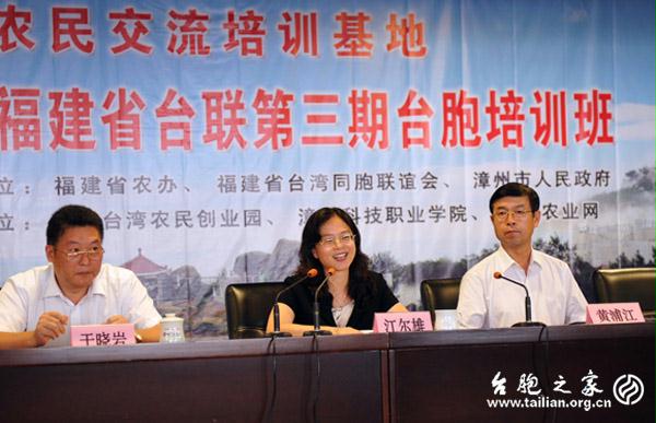 臺(tái)胞之家網(wǎng)福建臺(tái)聯(lián)訊:9月24日上午,在風(fēng)景秀麗的漳州科技學(xué)院校園,海峽兩岸觀光休閑農(nóng)業(yè)創(chuàng)業(yè)暨省臺(tái)聯(lián)第三期臺(tái)胞培訓(xùn)班順利開班。來自福建省各地的中青年臺(tái)胞及漳州市受訓(xùn)學(xué)員、江西吉安市受訓(xùn)學(xué)員共100多人參加了培訓(xùn)。福建省臺(tái)聯(lián)江爾雄會(huì)長(zhǎng)、漳州市政府黃浦江副市長(zhǎng)、福建省農(nóng)業(yè)廳陳弁副處長(zhǎng)、漳州市政府于曉巖副秘書長(zhǎng)、漳州市農(nóng)辦郭福泉主任、漳浦縣陳善平副縣長(zhǎng)及漳州科技學(xué)院吳長(zhǎng)彬院長(zhǎng)等領(lǐng)導(dǎo)參加了培訓(xùn)班開學(xué)式。