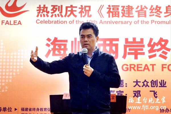 本次講堂邀請海峽兩岸著名公益人鄧飛和臺灣著名學(xué)者同臺演講。鄧飛先生是中國知名調(diào)查記者、《鳳凰周刊》編委。先后發(fā)起微博打拐、免費(fèi)午餐、大病醫(yī)保公益、暖流計(jì)劃、女童保護(hù)和讓候鳥飛、中國水安全計(jì)劃等8個(gè)公益項(xiàng)目和1個(gè)社會型企業(yè)e農(nóng)計(jì)劃,致力增加鄉(xiāng)村兒童權(quán)利,保護(hù)鄉(xiāng)村環(huán)境,發(fā)展農(nóng)村經(jīng)濟(jì)。他使用移動互聯(lián)網(wǎng)工具眾籌眾包,開創(chuàng)了互聯(lián)網(wǎng)微公益模式,掀起中國公益慈善界的一場革命。講堂上,鄧飛始終站著手持話筒,用一口柔軟的湖南普通話,在現(xiàn)場分享了“免費(fèi)午餐”的背后故事,講了一個(gè)個(gè)“柔軟改變中國”的故事。他說,李克強(qiáng)總理的“大眾創(chuàng)業(yè)”和“大眾創(chuàng)新”是潮流所趨,廣闊的農(nóng)村有創(chuàng)業(yè)前途,未來20年是一個(gè)新的機(jī)遇。