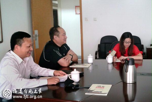 福建省臺(tái)聯(lián)副會(huì)長(zhǎng)梁志強(qiáng)(左1)向媒體朋友介紹活動(dòng)籌備情況 鐘曉惠/攝影