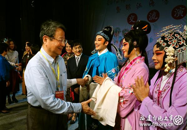 閩南師范大學(xué)藝術(shù)學(xué)院錦歌表演藝術(shù)團(tuán),廈門市歌仔戲研習(xí)中心,邵江海嫡傳弟子、薌劇著名表演藝術(shù)家紀(jì)招治老先生,臺(tái)灣歌仔戲表演藝術(shù)家林美香,臺(tái)灣歌仔戲表演藝術(shù)家林顯源,龍海市歌仔戲(薌劇)傳承保護(hù)中心,以及漳州市歌仔戲(薌劇)等精彩節(jié)日輪番上場,為在場觀眾奉上一份惟妙惟肖、美輪美奐的歌仔戲(薌劇)藝術(shù)大餐,博得了臺(tái)下觀眾的陣陣熱烈掌聲。來自新加坡的歌仔戲表演藝術(shù)家洪秀玉,鄭婭玲、楊月霞兩位國家一級(jí)演員以及國家一級(jí)演員陸逸紅亦閃亮登場,讓在場的觀眾再次一飽“眼福、耳福”的同時(shí),將該場演出再次推上了高潮,為當(dāng)晚交流演出活動(dòng)畫下了一個(gè)圓滿完美的句點(diǎn)。交流演出后,全國臺(tái)聯(lián)會(huì)長汪毅夫等領(lǐng)導(dǎo)上臺(tái)祝賀演出成功,并與大家合影留念。
