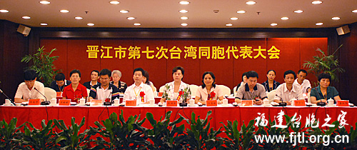 2008年8月22日,福建省晉江市第七次臺(tái)灣同胞代表大會(huì)召開,來自晉江市各領(lǐng)域的臺(tái)籍同胞代表60多人參加會(huì)議。福建省臺(tái)聯(lián)副會(huì)長柯連妹、晉江市委副書記陳健倩出席會(huì)議并講話。泉州市臺(tái)聯(lián)副會(huì)長陳嚴(yán)輝及晉江市有關(guān)部門、民主為黨派、人民團(tuán)體負(fù)責(zé)人到會(huì)祝賀。晉江市臺(tái)聯(lián)會(huì)長詹淑華代表六屆理事會(huì)作了《發(fā)揮優(yōu)勢,開拓進(jìn)取,促進(jìn)統(tǒng)一祖國大業(yè)作貢獻(xiàn)》的工作報(bào)告。