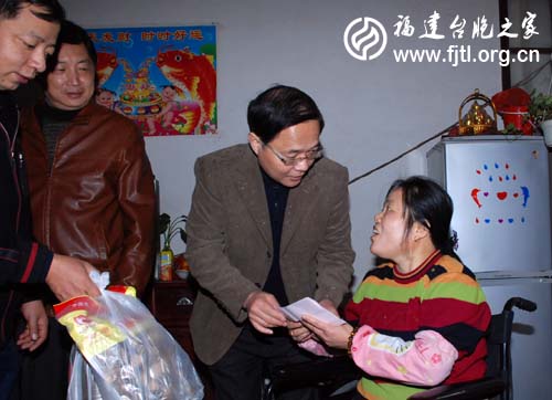 冒著淋漓小雨,省市臺聯(lián)一行走訪了在長樂市下崗臺胞陳玉妹、癱瘓困難臺胞陳秋美、孤寡老臺胞肖輝、貧困多病老臺胞陳水梅和夫妻雙下崗,女兒患白血病黃建國。在長樂,市委統(tǒng)戰(zhàn)部許副部長陪同慰問。