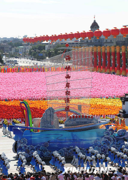 10月1日12時10分,在莊嚴巍峨的天安門城樓前,當(dāng)象征“海西揚帆”的 “大船”,揚起一面巨型的風(fēng)帆,飛騰朵朵“祥云”緩緩?fù)ㄟ^天安門時,帆上用醒目的紅字書寫七個大字——“海峽西岸經(jīng)濟區(qū)”,連同“船”首兩個1.5平方米的“福建”,襯托六位富有時代感惠安小姑娘顯得格外耀眼,顯示了福建人的智慧,也浸透了臺籍教師陳雯的心血。