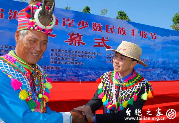 臺灣阿美族頭領(lǐng)為全國臺聯(lián)副會長紀(jì)斌(右)贈(zèng)送“頭領(lǐng)披肩”(攝影:鄭嵐) 全國臺聯(lián)副會長紀(jì)斌,福建省政協(xié)副主席鄧力平,省委統(tǒng)戰(zhàn)部副部長、省政協(xié)港澳臺僑和外事委員會副主任、省海外聯(lián)誼會常務(wù)副會長莊奕賢,全國臺聯(lián)副會長、省臺聯(lián)會長、廈門政協(xié)副主席陳耀中,省臺聯(lián)黨組書記、省臺辦副主任林衛(wèi)國,省人大臺工委副主任陳新云,省民革副主委黃健兒,省臺盟副主委江爾雄,省臺聯(lián)副會長葉露昆、柯連妹、盧紹荀、陳小凡、葉勁光,臺灣原住民族人文關(guān)懷協(xié)會理事長陳士章先生、中華海峽兩岸原住民暨少數(shù)民族交流協(xié)會常務(wù)理事梁明輝先生、臺灣都蘭馬拉道合唱團(tuán)團(tuán)長張健三先生、加拿大華人經(jīng)濟(jì)文化交流協(xié)會創(chuàng)會會長陳信誠等領(lǐng)導(dǎo)嘉賓等出席了開幕式。