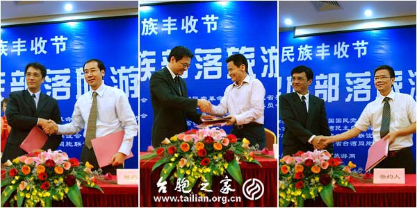 三個(gè)意向書分別是:臺灣創(chuàng)業(yè)育成產(chǎn)銷拓展中心副執(zhí)行長黃裕銘先生與福建省鄉(xiāng)村休閑發(fā)展協(xié)會(huì)副會(huì)長游向陽先生代表簽訂“推動(dòng)臺灣少數(shù)民族部落旅游合作意向書”;臺灣中華優(yōu)質(zhì)旅游協(xié)會(huì) 代表黃裕仁先生、福建省中國旅行社副總經(jīng)理陳曉東先生代表簽訂“深化閩臺少數(shù)民族地區(qū)特色旅游合作項(xiàng)目對接意向書”;臺灣原住民族人文關(guān)懷協(xié)會(huì)代表林柏森先生、廈門市旅游協(xié)會(huì)常務(wù)副會(huì)長鄭金龍先生代表簽訂“深化廈門與臺灣少數(shù)民族地區(qū)特色旅游合作”意向書。