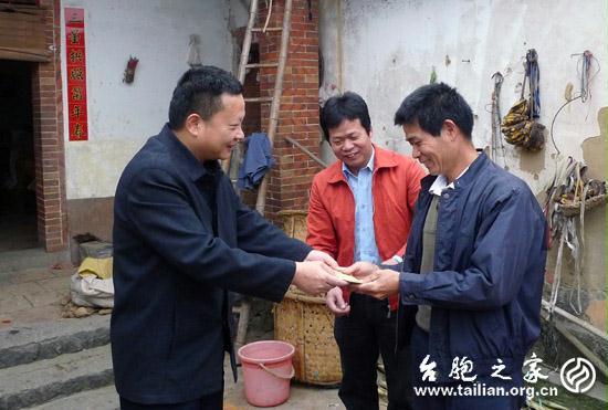 臺(tái)胞之家網(wǎng)福建臺(tái)聯(lián)訊:1月24-25日,福建省臺(tái)聯(lián)副會(huì)長(zhǎng)梁志強(qiáng)一行深入漳州市的薌城區(qū)、天寶鎮(zhèn)、龍海市等城郊、鄉(xiāng)村,看望慰問了老臺(tái)胞和臺(tái)胞特困戶,給他們送去了慰問金,并送上新春的祝福,表達(dá)了省臺(tái)聯(lián)“臺(tái)胞之家”對(duì)困難臺(tái)胞的關(guān)愛之情。漳州市臺(tái)聯(lián)會(huì)長(zhǎng)陳正煒、龍海縣委常委、統(tǒng)戰(zhàn)部長(zhǎng)王勁東、漳州市臺(tái)聯(lián)聯(lián)絡(luò)科、龍海市臺(tái)聯(lián)負(fù)責(zé)人陪同走訪。