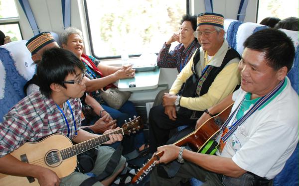 2008年首屆“豐收節(jié)”上,臺灣鄉(xiāng)親乘火車一路歡歌 鄭嵐/攝影