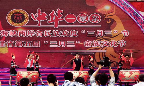 福建臺(tái)胞之家網(wǎng)訊: 4月9日上午,由國(guó)家民委、國(guó)臺(tái)辦、全國(guó)臺(tái)聯(lián)、省政府指導(dǎo),省委統(tǒng)戰(zhàn)部、省民族與宗教事務(wù)廳、中國(guó)少數(shù)民族作家協(xié)會(huì)、寧德市人民政府、福安市人民政府支持,省海外聯(lián)誼會(huì)、省少數(shù)民族發(fā)展基金會(huì)、福建省臺(tái)聯(lián)、省文聯(lián)、省畬家企業(yè)商會(huì)參與主辦的中華一家親•2016年海峽兩岸各民族歡度“三月三”節(jié)暨福建省第五屆“三月三”畬族文化節(jié)在福安市隆重開(kāi)幕。開(kāi)幕式上,兩岸少數(shù)民民歡歌載舞,共慶“三月三”傳統(tǒng)節(jié)日。