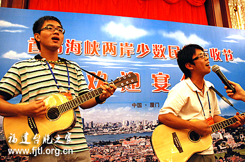 來(lái)自臺(tái)灣的巴奈合唱團(tuán)朋友們?yōu)橥硌绲臒崃覛夥账腥荆磁d登臺(tái)表演了原汁原味的臺(tái)灣原住民歌曲,把晚會(huì)推向高潮。這是海峽兩岸首次臺(tái)灣原住民與生活在祖國(guó)大陸的高山族同胞的一次大聚會(huì),也是海峽兩岸擴(kuò)大交流交往的一個(gè)新平臺(tái),加快兩岸同胞相互了解的一個(gè)新嘗試。正像臺(tái)灣原住民族人文關(guān)懷協(xié)會(huì)理事長(zhǎng)陳士章先生在致辭中講到的:今年是第一次,希望明年、后年,一屆一屆地辦下去。臺(tái)灣原住民大學(xué)生吉它彈唱“彩虹”,“愿海峽兩岸從此架起友誼的彩虹”。
